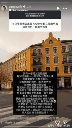 袁艾菲12日在Instagram限时动态分享一段过往恋情的荒谬经历,她透露,曾经有任男友在旅游期间「每30分钟到1小时就说他想要大便」,甚至还会带着Wi-Fi机进厕所,但当时的她只能无奈等待,心里满是疑惑。